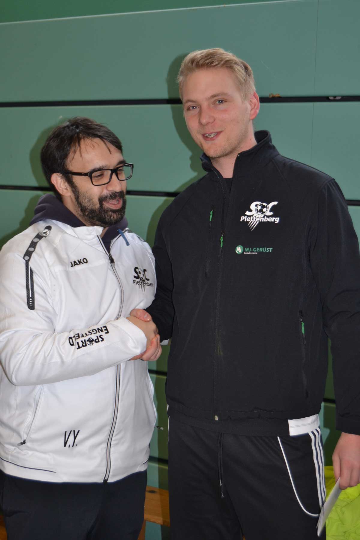 aben heute die Lizenz erworben, zwei haben in diesem Zuge ihre Lizenz verlängern lassen und zwei haben diese im vergangenen Jahr auf eigene Faust erworben. Das sind 18 (!) Lizenzinhaber und für den SC Plettenberg eine große Sache. So haben wir von unten nach oben alle Mannschaften mit geschulten Trainern ausgestattet.“, hob er in seiner Ansprache hervor und bedankte sich am Ende nochmal bei der Sparkasse im Märkischen Kreis, die mit ihrem Engagement den Lehrgang zum großen Teil unterstützt hatte. Ursprünglich hatten 17 Teilnehmer den Lehrgang begonnen. Drei von ihnen mussten krankheitsbedingt während dieser Zeit aussteigen, haben aber schon betont, bei nächster Gelegenheit weiter zu machen und auch den Trainerschein zu erwerben. • ru